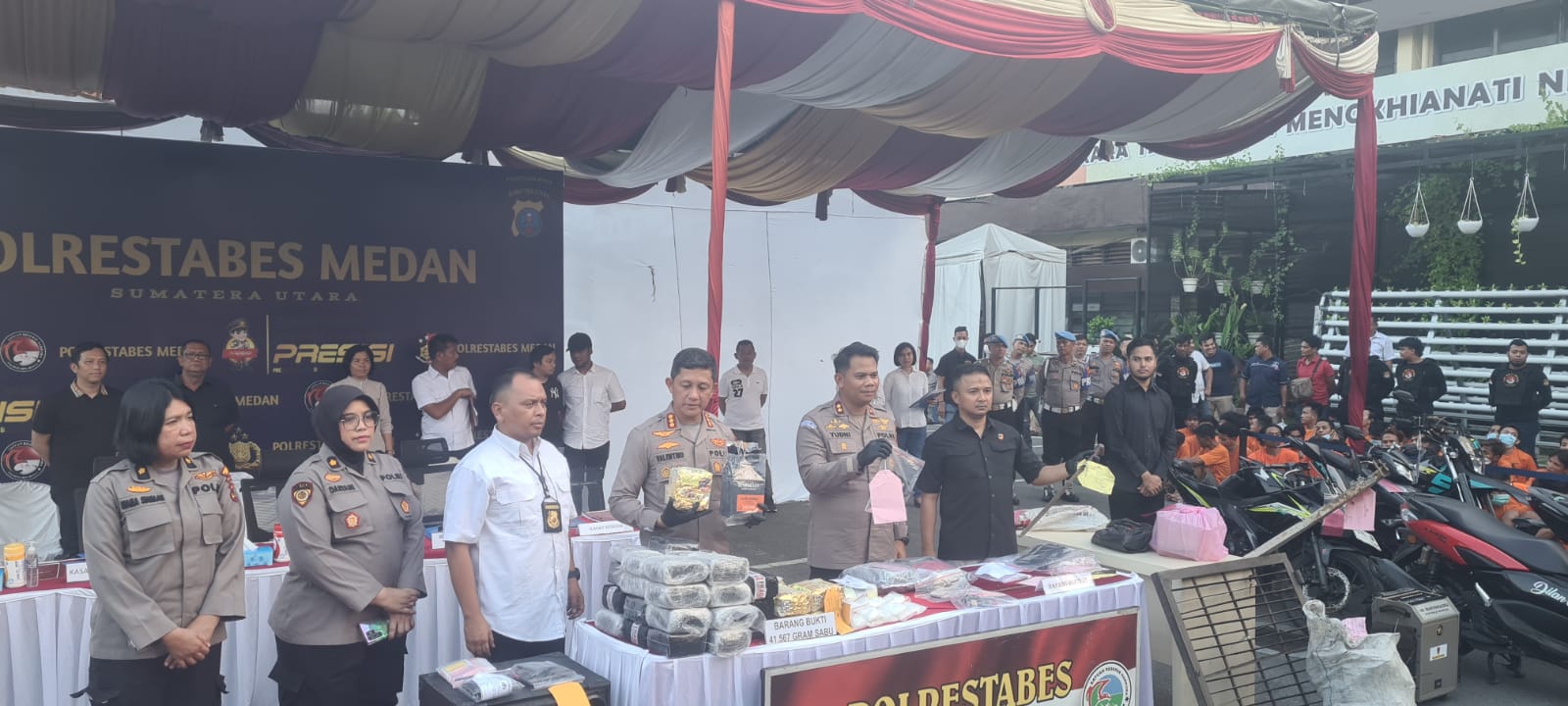 MEDAN, suarapembaharuan.com - Polrestabes jajarannya menangkap sejumlah bandar narkoba dan pelaku kejahatan jalanan di wilayah hukumnya berikut barang bukti 41.567 gram sabu dan senjata tajam, baju dan 5 unit sepeda motor hasil kejahatan.